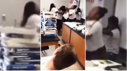 In the 24-second clip, two women appeared to punch and grab each other several times, while students yelled at them to stop.
